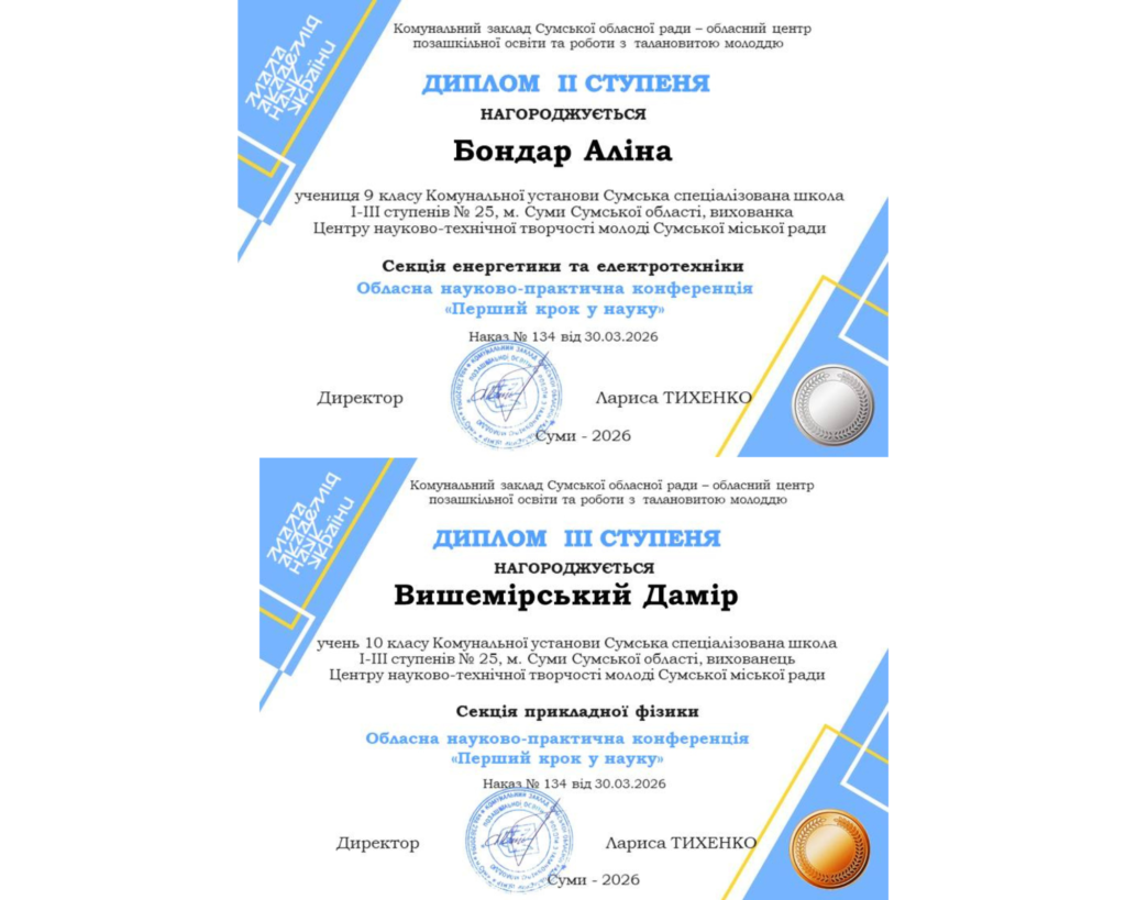 В цьому році, серед 25 учасників, приймали участь у конкурсі проєктів «Перший крок в науку» у секції теоретична фізика і наші учні.